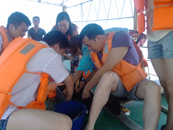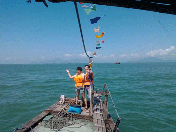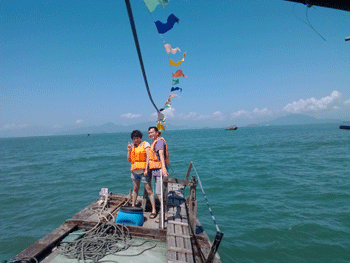 第二天,公司又組了海上捕魚活動(dòng),,于是我們?cè)僖淮翁ど萧~船,享受著大海的擁抱和飄逸的海風(fēng),讓我們每一根神經(jīng)都放松到了極點(diǎn),這時(shí),膽大的兩位同事還在船頭上演了一段朱麗葉和羅密歐.